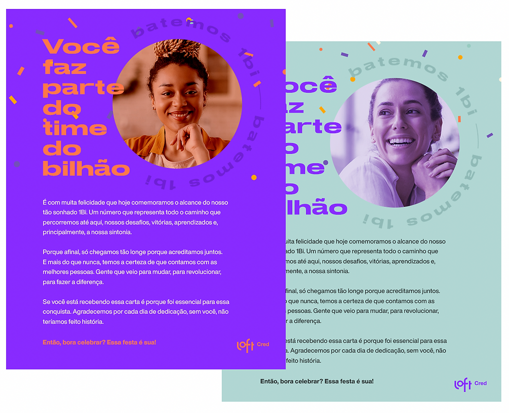 KV e materiais criados para a celebração da empresa por alcançar a meta de 1 Bi em emissão. O objetivo foi trazer um desdobramento da identidade visual que já usamos na marca do Grupo Loft, com um tom de diversão e comemoração para o marco que batemos.